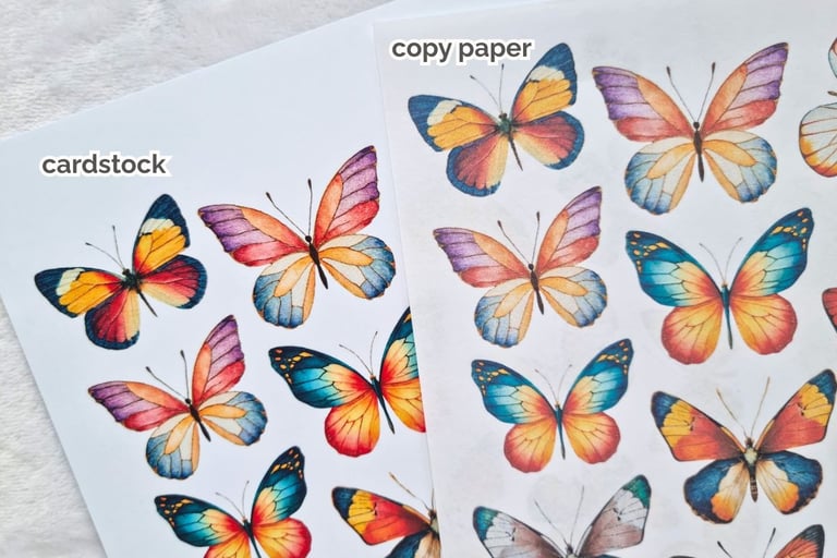 Home printing on copy paper: The result is lighter (a bit faded) with visible paper texture. To make them sturdier, I glued them onto colored or white card stock.